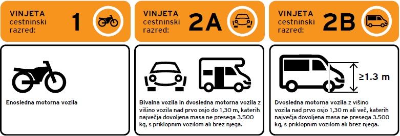 Motorna kolesa, osebna in kombinirana vozila, katerih največja dovoljena masa ne presega 3,5 tone, morajo biti za vožnjo po vseh slovenskih avtocestah in tistih hitrih cestah, ki jih upravlja in vzdržuje upravljavec cestninskih cest, opremljena z vinjeto.